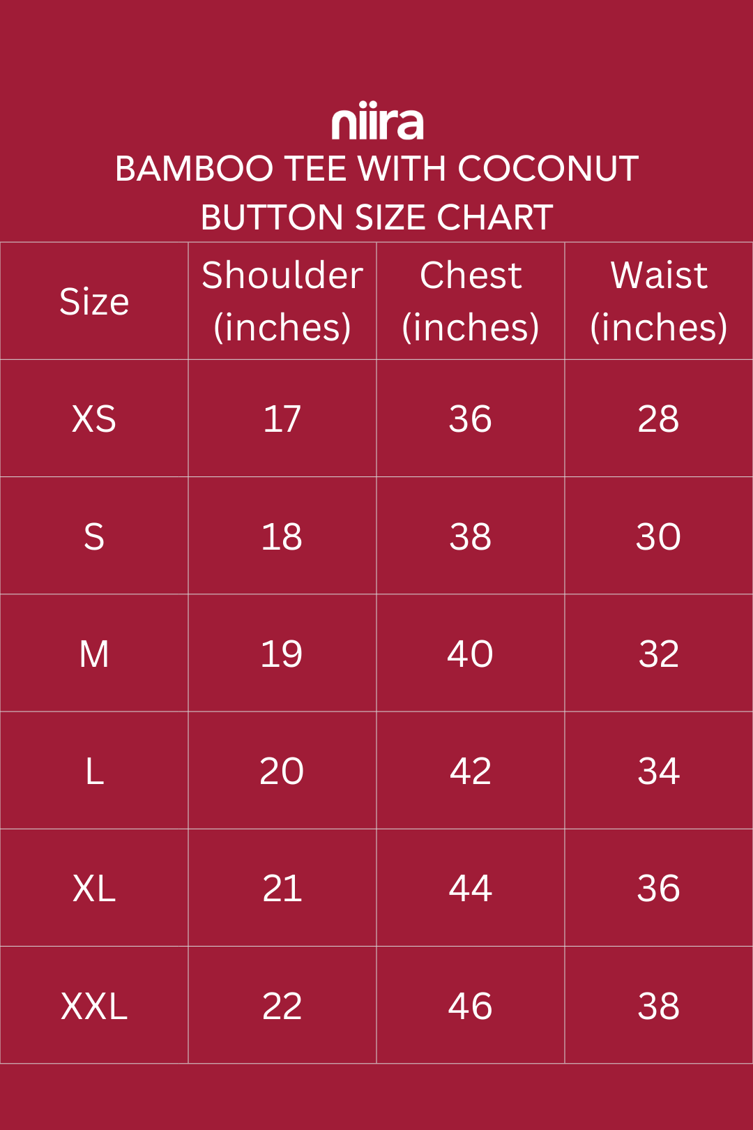 | Size | Shoulder (inches) | Chest (inches) | Waist (inches) |