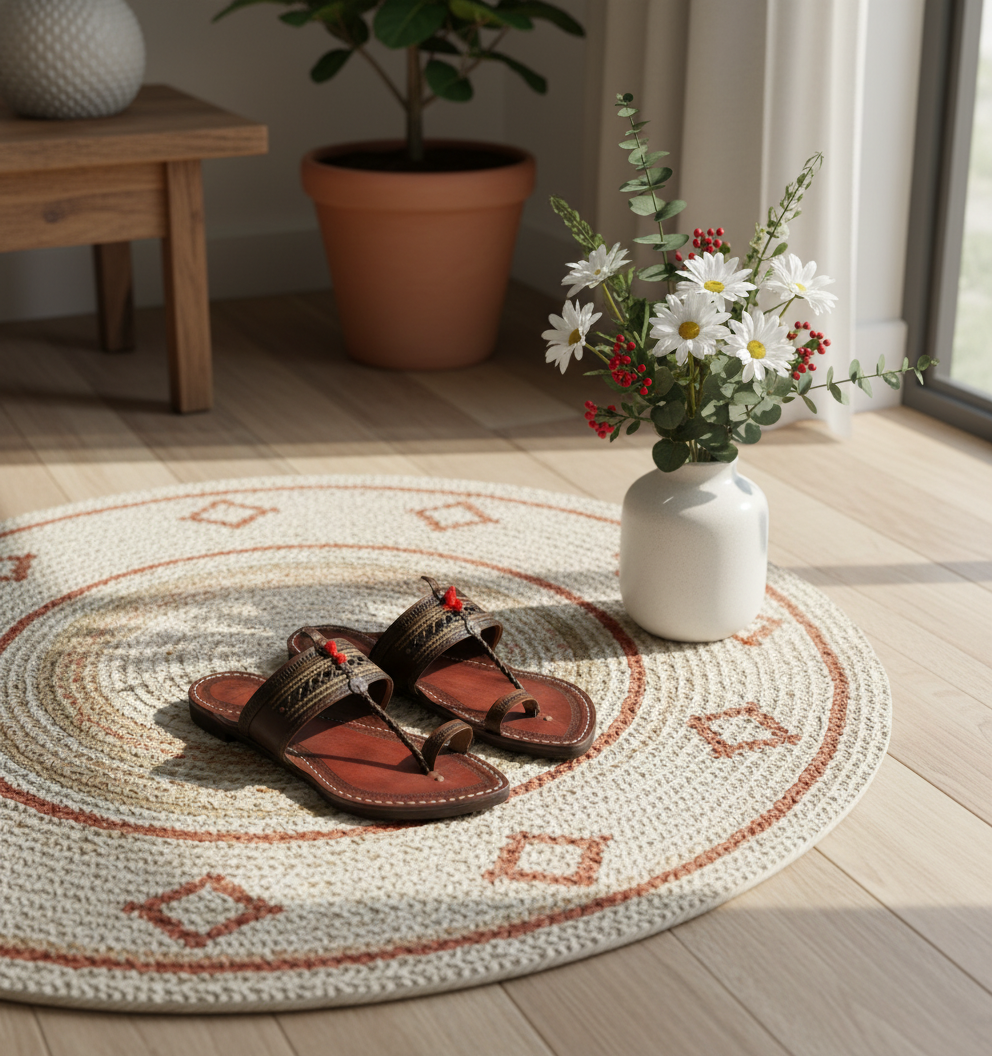 With its deep brown leather, hand-braided straps, and a striking red accent at the center, Yuga blends tradition with a raw, masculine energy. It’s the kind of chappal that feels rooted in culture but still sharp enough for today’s style. The rich tones and strong structure make it a pair you reach for when you want to look refined without overthinking it.